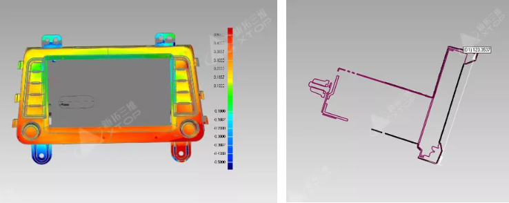 掃描對象某品牌汽車的車載導航系統(tǒng) 客戶需求檢測整個裝配件的裝配偏差 使用設備XTOM-MATRIX三維光學面掃描系統(tǒng)測試過程對被測物表面進行處理,噴涂顯像劑,粘貼標志點,將其置于工作臺。使用XTOM-MATRIX進行掃描,自動完成數(shù)據(jù)拼接。將掃描后的數(shù)據(jù)與設計模型在Geomagic Qualify軟件進行對比,設置對應的公差,即可得到相應的檢測結(jié)果,在關(guān)鍵位置進行截線,即可對截面偏差進行檢測和分析,最終輸出檢測報告。案例背景目前車載導航系統(tǒng)已經(jīng)是所有汽車的標準配置,對于該類產(chǎn)品的檢測需求也日益增加。因為塑料產(chǎn)品的結(jié)構(gòu)容易變形,產(chǎn)品自身就容易產(chǎn)生裝配變形,也就不便于使用夾具和傳統(tǒng)設備進行檢測。而使用三維光學面掃描技術(shù),可以對被測物進行非接觸式測量,不會對被測物施加額外的變形,還能夠進行全表面,深孔和深槽的檢測,高效準確的完成檢測需求。