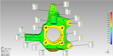 該汽車(chē)零部件制造企業(yè)需要考慮對(duì)轉(zhuǎn)向節(jié)進(jìn)行全尺寸檢測(cè),避免非重要尺寸偏差造成的品質(zhì)下降;測(cè)量轉(zhuǎn)向節(jié)孔位,孔本身的精度、配合結(jié)構(gòu)與配合結(jié)構(gòu)之間的相對(duì)精度,都要達(dá)到非常高的精度標(biāo)準(zhǔn);另外,要考量受力部位的壁厚、加強(qiáng)結(jié)構(gòu)的設(shè)計(jì)結(jié)果,抽殼的部位精度,因?yàn)檫@涉及到產(chǎn)品壽命及材料的節(jié)省,影響到產(chǎn)品品質(zhì)和成本管控。