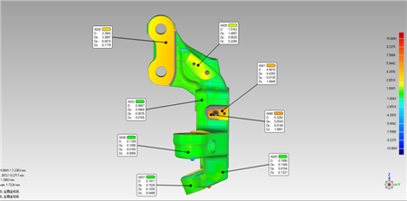 將掃描數(shù)據(jù)與CAD模型進(jìn)行比對(duì),數(shù)模比對(duì),獲得偏差色譜圖及具體偏差數(shù)值。對(duì)于孔本身的精度保證,新拓三維技術(shù)人員還對(duì)零件單個(gè)進(jìn)行掃描,零件組裝整體掃描,從而獲得精確的裝配位置。零件三維掃描后,可及時(shí)將數(shù)據(jù)反饋給裝配、生產(chǎn)線,提升生產(chǎn)及裝配精度。